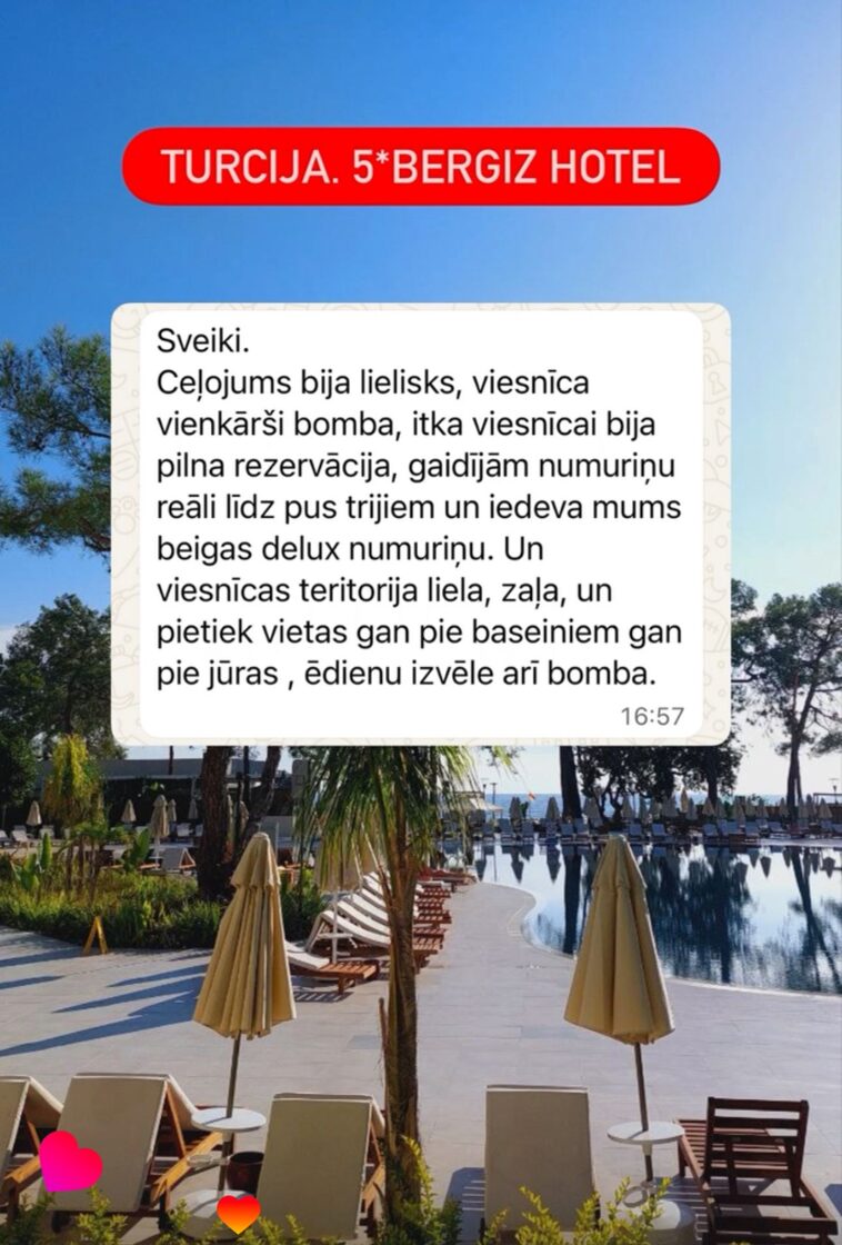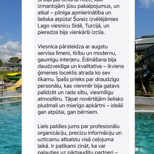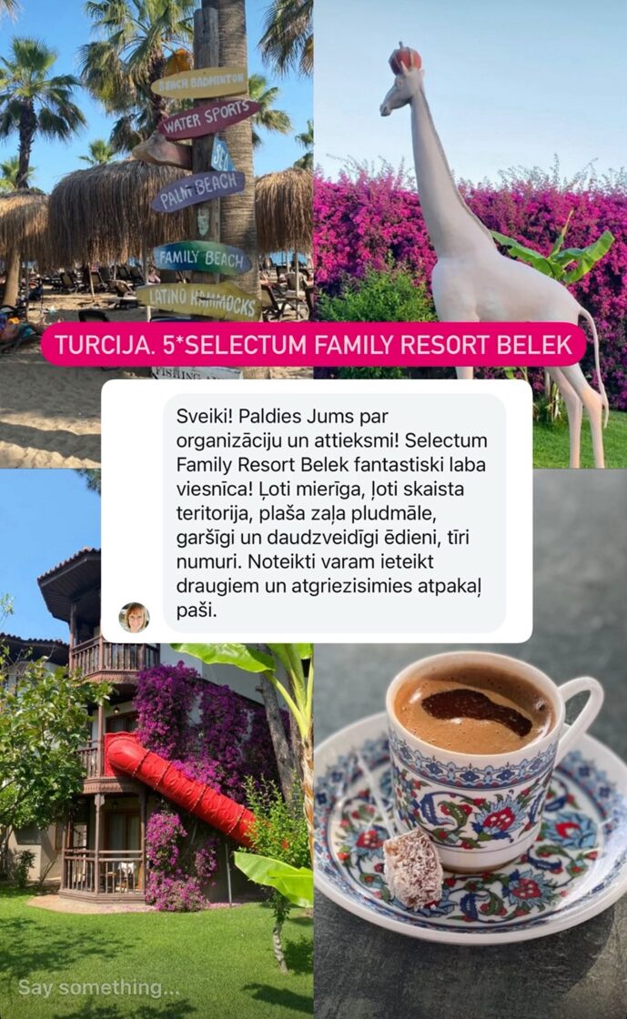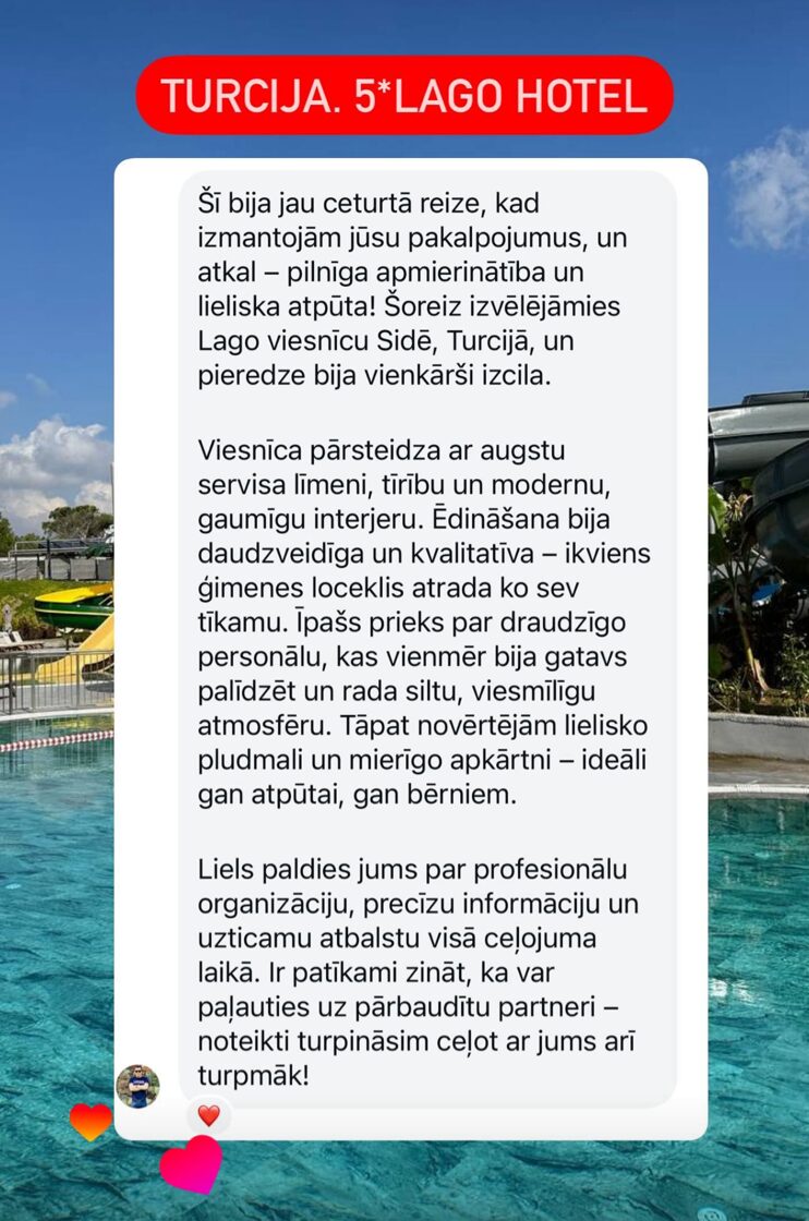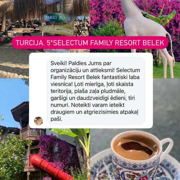 Turcija ir populārākais vasaras galamērķis. Turcija ir tuvu, un Turcijā ir ļoti labas viesnīcas par labām cenām ar all inclusive ēdināšanu. Gandrīz visām 5*viesnīcām ir savi akvaparki un labas izklaides programmas. Tāpēc Turciju ļoti iemīļojušas ģimenes ar bērniem. Viss, kas vajadzīgs labai atpūtai, ir pieejams viesnīcas teritorijā.